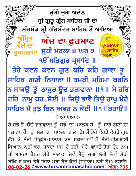 Amrit Vele da Hukamnama Sri Darbar Sahib, Amritsar Sahib, Ang 735, 08-02-2026