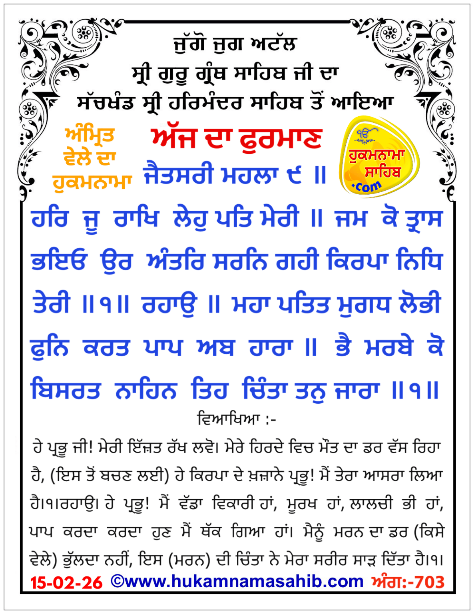 Amrit Wele Da Mukhwak Sachkhand Sri Harmandir Sahib Amritsar, 15-02-26 Ang 703
