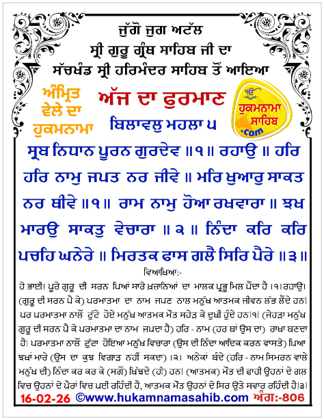 Amrit Vele da Hukamnama Sachkhand Sri Harmandir Sahib, Amritsar 16-02-2026 Ang 806