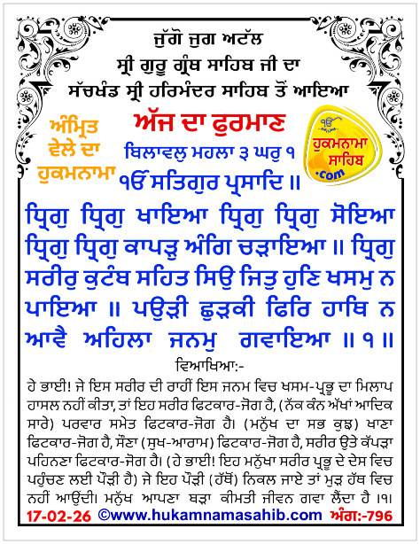 AMRIT WELE DA HUKAMNAMA SRI DARBAR SAHIB SRI AMRITSAR, ANG 796, 17-02-2026