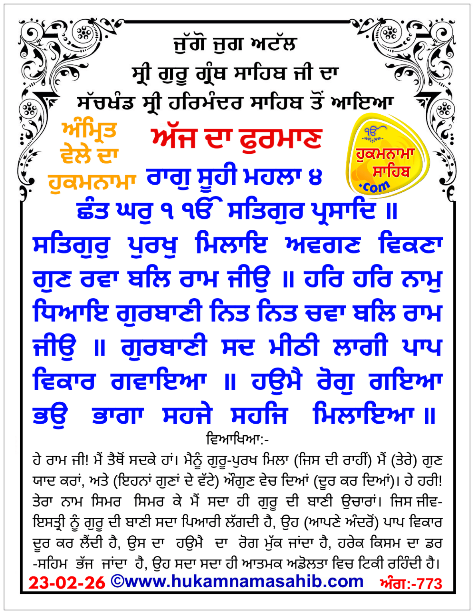 AMRIT VELE DA HUKAMNAMA SRI DARBAR SAHIB, SRI AMRITSAR, ANG 773, 23-02-2026