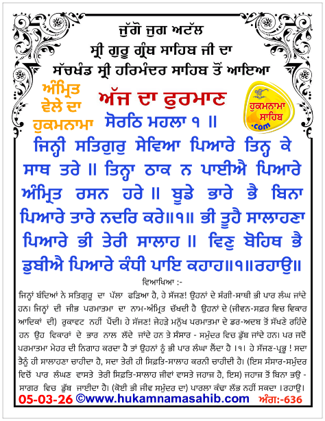 Sachkhand Sri Harmandir Sahib Amritsar Vikhe Hoea Amrit Wele Da Mukhwak, Ang 636 Date: 05-03-2026
