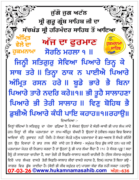 Sachkhand Sri Harmandir Sahib Amritsar Vikhe Hoea Amrit Wele Da Mukhwak, Ang 636 Date: 07-03-2026