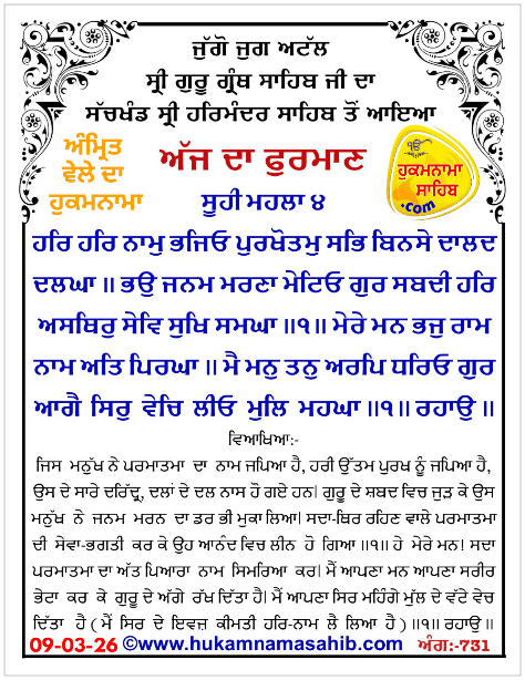 AMRIT VELE DA HUKAMNAMA SRI DARBAR SAHIB SRI AMRITSARANG 731, 09-03-26
