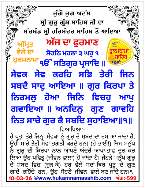 Amrit Vele da Hukamnama Sri Darbar Sahib Amritsar, Ang 599, 10-03-2026