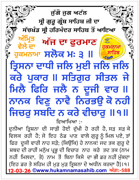 Amrit vele da Hukamnama Sri Darbar Sahib, Amritsar, Ang 588, 12-03-2026