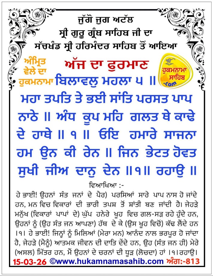 Amrit Vele da Hukamnama Sri Darbar Sahib, Amritsar, Ang 813, 15-03-2026