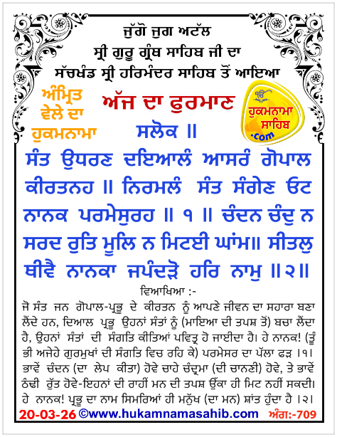Amrit Wele da Hukamnama Sachkhand Sri Darbar Sahib, Amritsar, Ang 709, 20-03-2026
