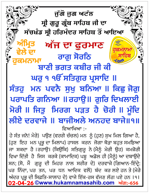 Amrit Wele Da Hukamnama Sachkhand Sri Harmandir Sahib Amritsar Ang 656 Date 02-04-2026