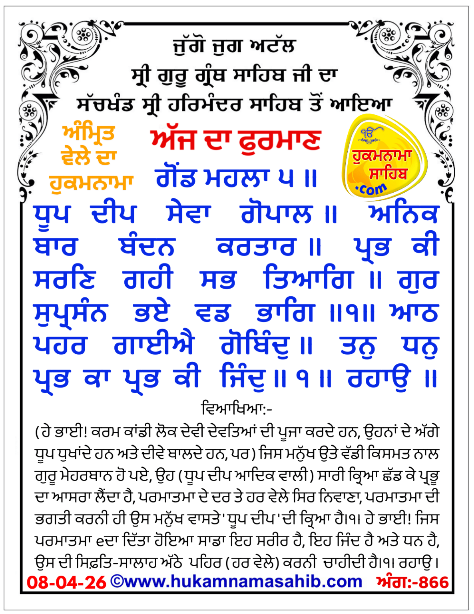AMRIT VELE DA HUKAMNAMA SRI DARBAR SAHIB AMRITSAR, ANG 866, 08-04-2026