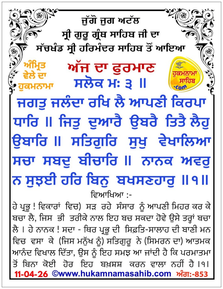 Amrit wele da mukhwakh shri Harmandar sahib amritsar sahib ji, Ang-853, 11-04-2026