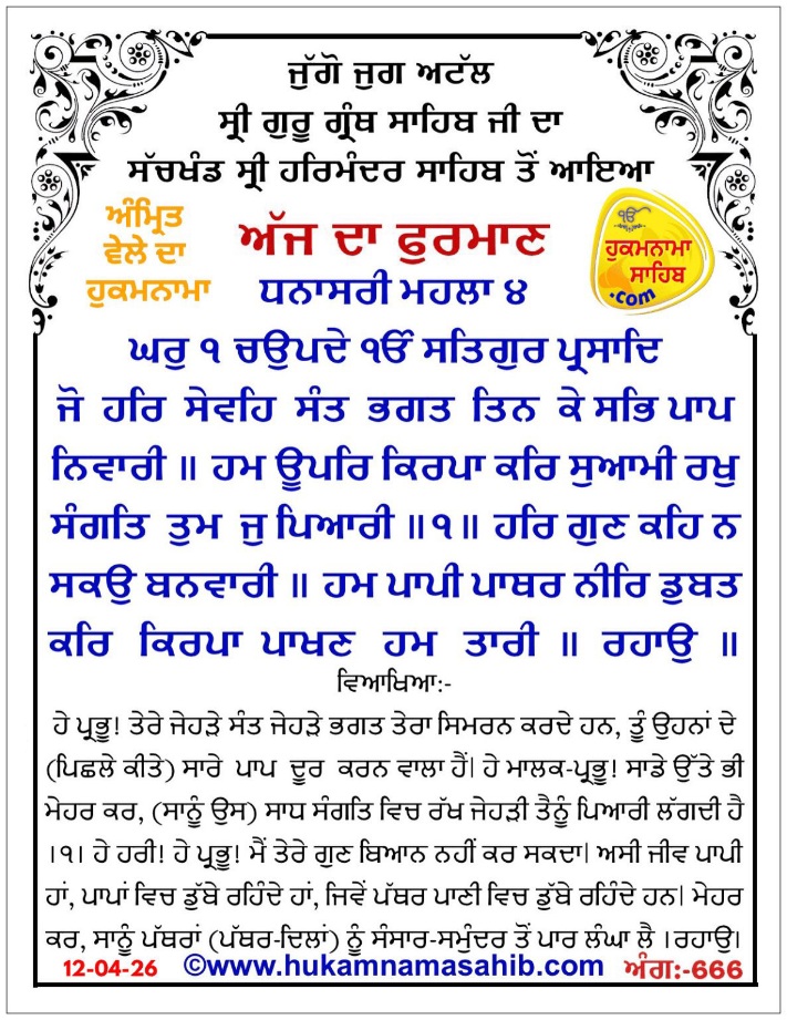 Sachkhand Sri Harmandir Sahib Amritsar Vekhe Hoea Amrit Wele Da Mukhwak: 12-04-26, Ang 666