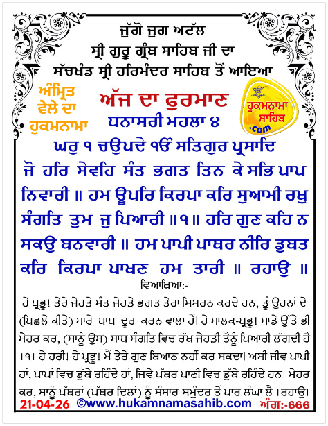 Amrit Wele Da Hukamnama Sachkhand Sri Harmandir Sahib Amritsar, 21-04-26, Ang 666