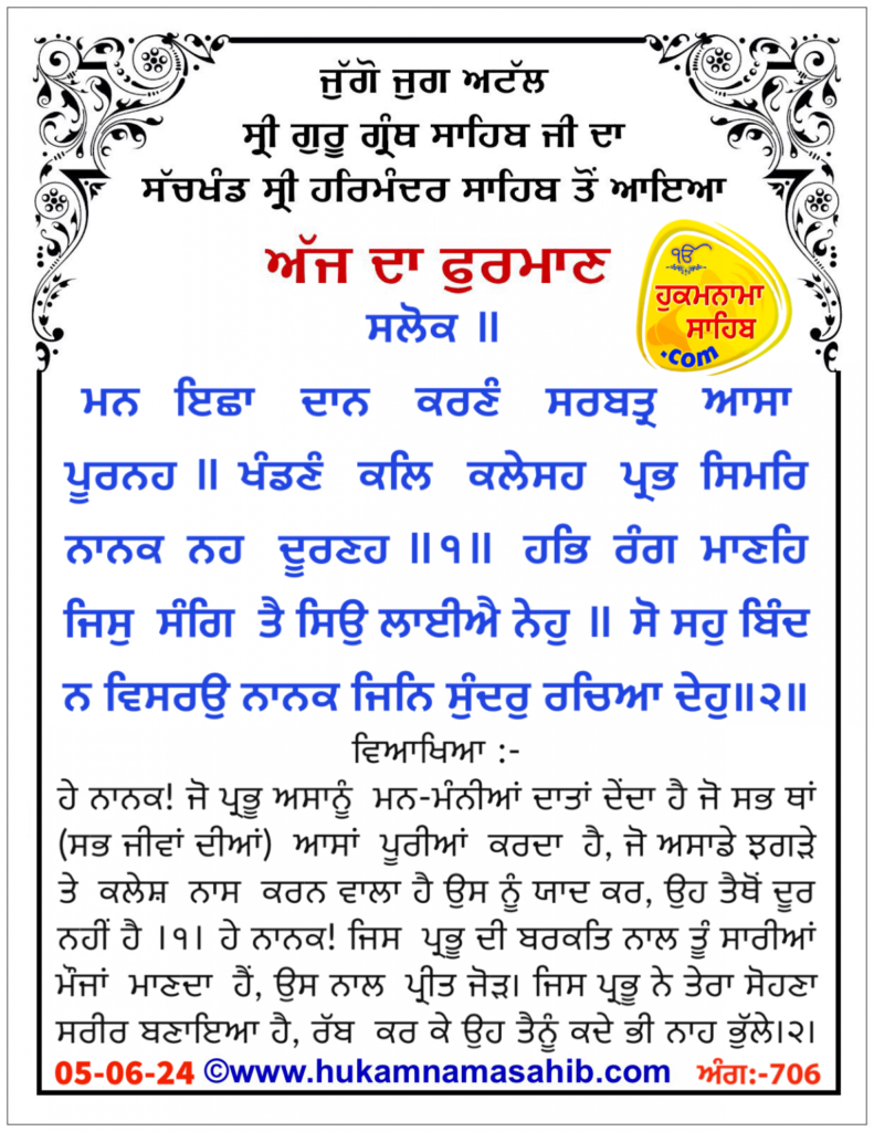 Sachkhand Sri Harmandir Sahib Amritsar Vekhe Hoea Amrit Wele Da Mukhwak Ang 706 : 05-06-2024