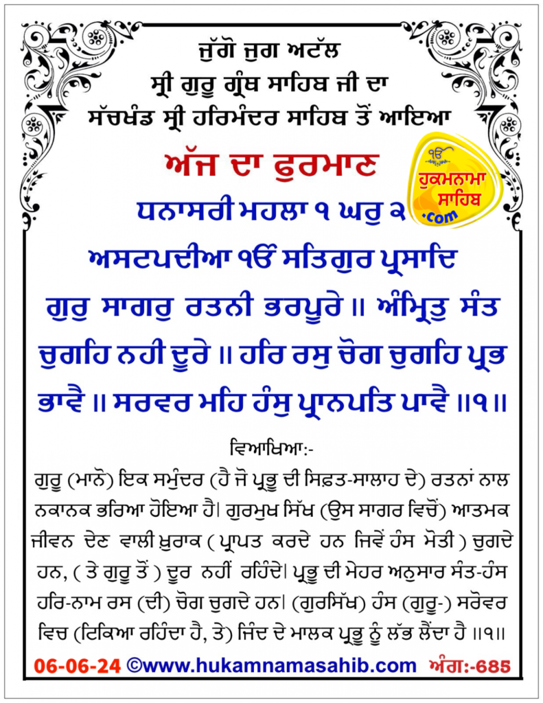 Amrit Wele da Mukhwak Sachkhand Shri Harmandar Sahib Amritsar, Ang-685, 06-06-2024