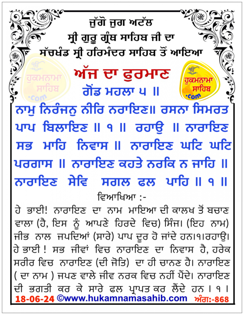 ਅੰਮ੍ਰਿਤ ਵੇਲੇ ਦਾ ਹੁਕਮਨਾਮਾ ਸ੍ਰੀ ਦਰਬਾਰ ਸਾਹਿਬ, ਅੰਮ੍ਰਿਤਸਰ, ਮਿਤੀ 06-18-2024 ਅੰਗ 868