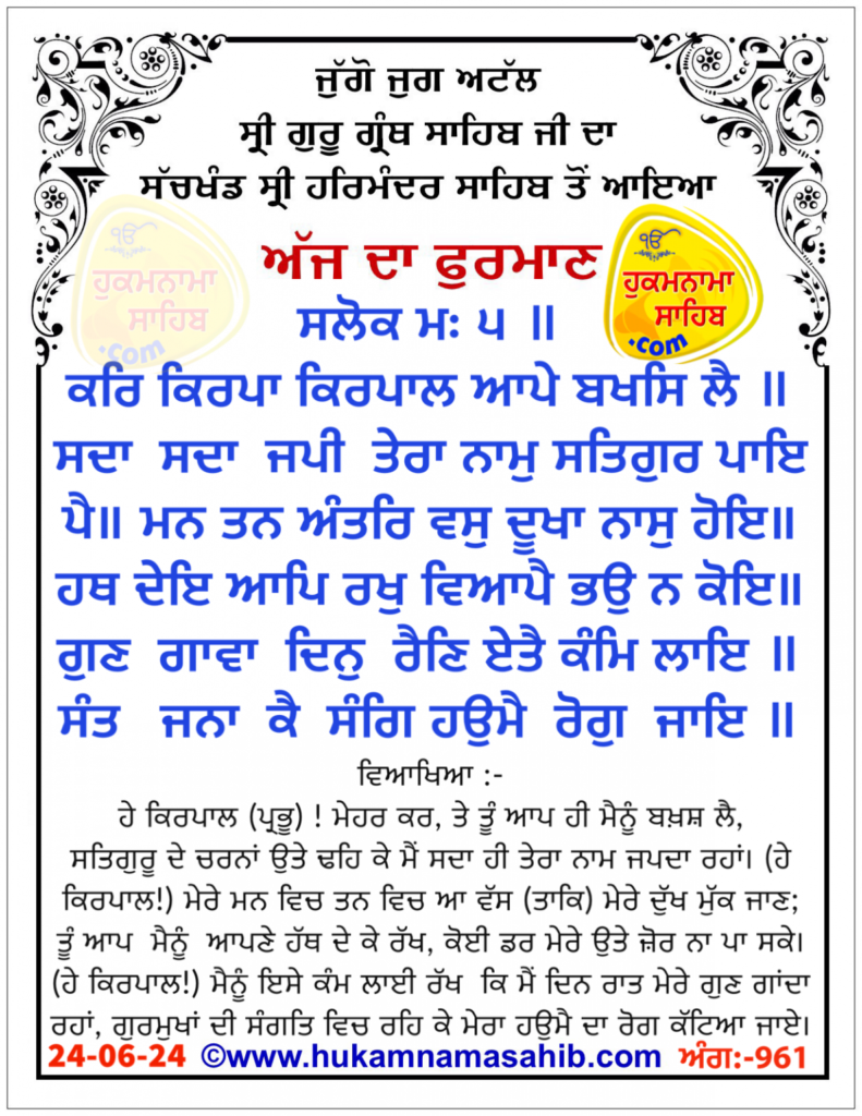 ਅੰਮ੍ਰਿਤ ਵੇਲੇ ਦਾ ਹੁਕਮਨਾਮਾ ਸ੍ਰੀ ਦਰਬਾਰ ਸਾਹਿਬ, ਅੰਮ੍ਰਿਤਸਰ, ਮਿਤੀ 24-06-2024 ਅੰਗ 961