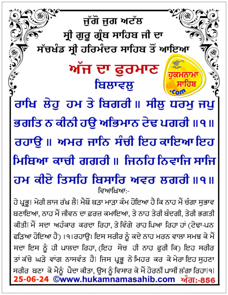 ਅੰਮ੍ਰਿਤ ਵੇਲੇ ਦਾ ਹੁਕਮਨਾਮਾ ਸ੍ਰੀ ਦਰਬਾਰ ਸਾਹਿਬ, ਅੰਮ੍ਰਿਤਸਰ, ਮਿਤੀ 06-25-2024 ਅੰਗ 856