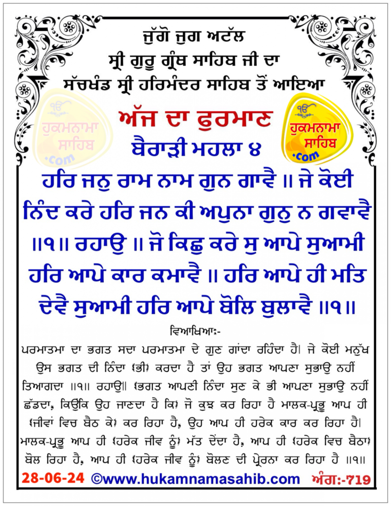 ਅੰਮ੍ਰਿਤ ਵੇਲੇ ਦਾ ਹੁਕਮਨਾਮਾ ਸ੍ਰੀ ਦਰਬਾਰ ਸਾਹਿਬ, ਅੰਮ੍ਰਿਤਸਰ, ਮਿਤੀ 28-06-2024 ਅੰਗ 719