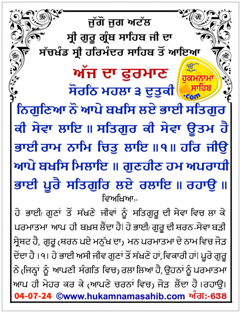Amrit vele da Hukamnama Sri Darbar Sahib Sri Amritsar, Ang 638, 04-07-2024