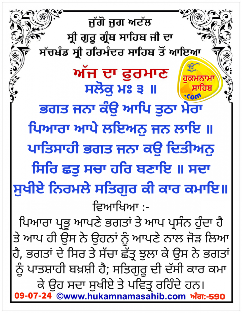 ਅੰਮ੍ਰਿਤ ਵੇਲੇ ਦਾ ਹੁਕਮਨਾਮਾ ਸ੍ਰੀ ਦਰਬਾਰ ਸਾਹਿਬ, ਅੰਮ੍ਰਿਤਸਰ, ਮਿਤੀ 09-07-2024 ਅੰਗ 590