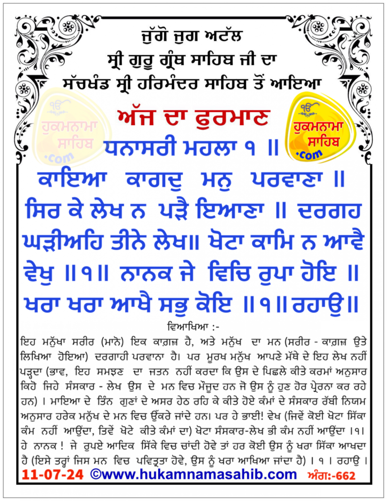 Meaning: The body is the paper, and the mind is the inscription written upon it. The ignorant fool does not read what is written on his forehead. In the Court of the Lord, three inscriptions are recorded. Behold, the counterfeit coin is worthless there. ||1|| O Nanak Ji, if there is silver in it, Then everyone proclaims, It is genuine, it is genuine.||1|| Pause || The Qazi tells lies and eats filth; The Brahmin kills and then takes cleansing baths. The Yogi is blind, and does not know the Way. The three of them devise their own destruction. ||2|| He alone is a Yogi, who understands the Way. By Guru’s Grace, he knows the One Lord. He alone is a Qazi, who turns away from the world, And who, by Guru’s Grace, remains dead while yet alive. He alone is a Brahmin, who contemplates God. He saves himself, and saves all his generations as well. ||3|| One who cleanses his own mind is wise. One who cleanses himself of impurity is a Muslim. One who reads and understands is acceptable. Upon his forehead is the Insignia of the Court of the Lord. ||4||5||7||