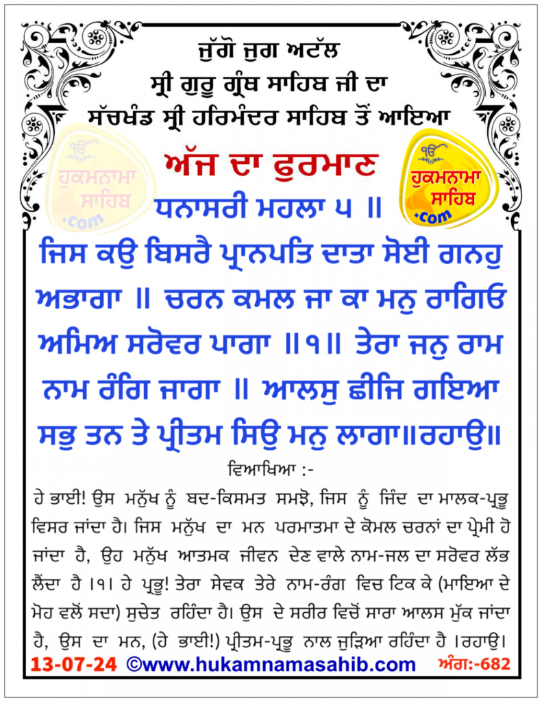 ਅੰਮ੍ਰਿਤ ਵੇਲੇ ਦਾ ਹੁਕਮਨਾਮਾ ਸ੍ਰੀ ਦਰਬਾਰ ਸਾਹਿਬ, ਅੰਮ੍ਰਿਤਸਰ, ਮਿਤੀ 13-07-2024 ਅੰਗ 682