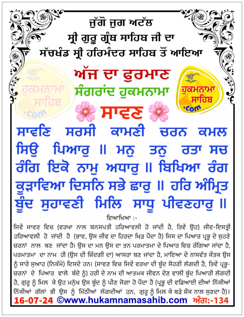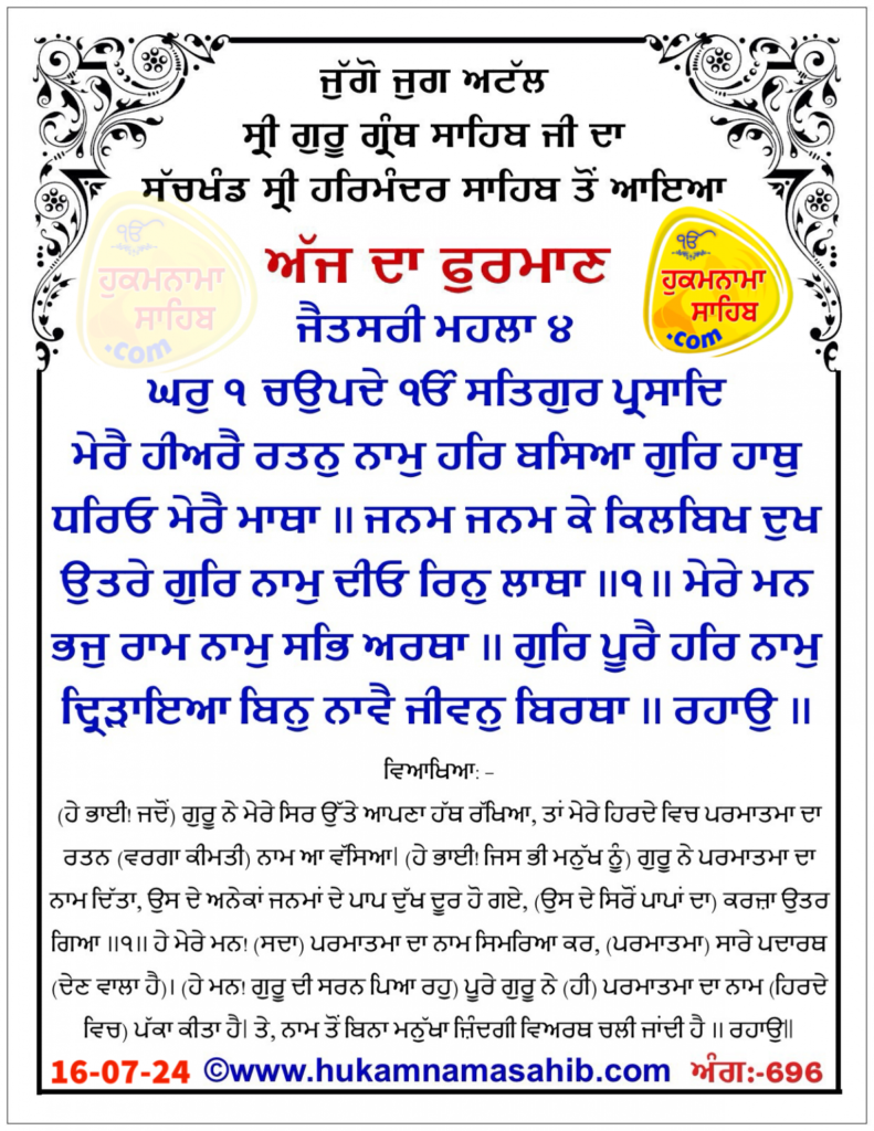 Sachkhand Sri Harmandir Sahib Amritsar Vikhe Hoyea Amrit Wele Da Mukhwak Ang 696 : 16-07-2024