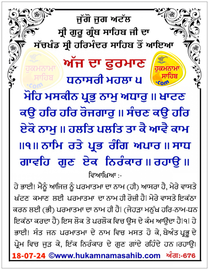 ਅੰਮ੍ਰਿਤ ਵੇਲੇ ਦਾ ਹੁਕਮਨਾਮਾ ਸ੍ਰੀ ਦਰਬਾਰ ਸਾਹਿਬ, ਅੰਮ੍ਰਿਤਸਰ, ਮਿਤੀ 18-07-2024 ਅੰਗ 676