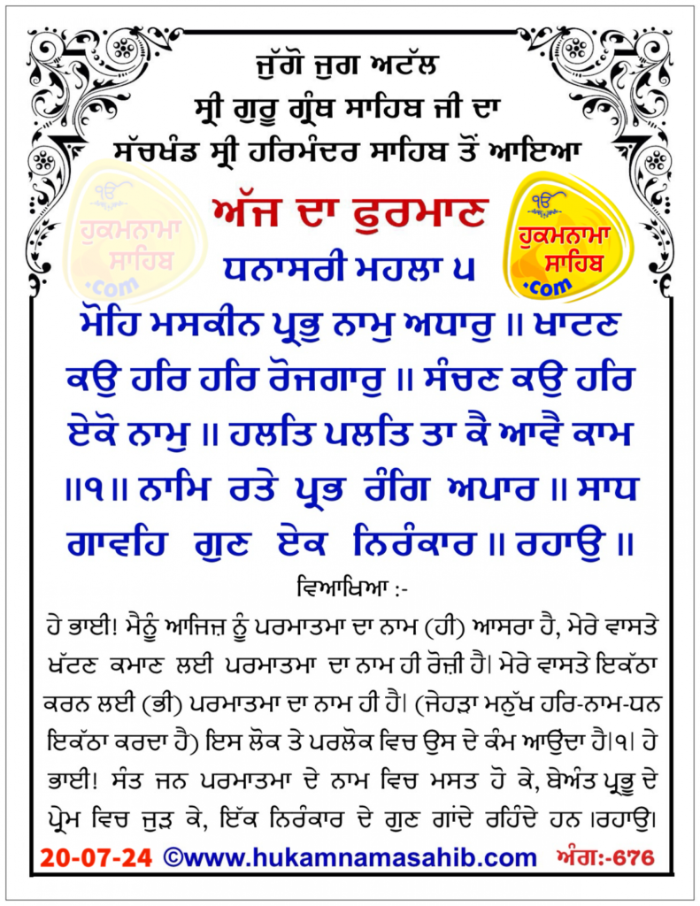 Sachkhand Sri Harmandir Sahib Amritsar Vikhe Hoyea Amrit Wele Da Mukhwak Ang: 676 20-07-24