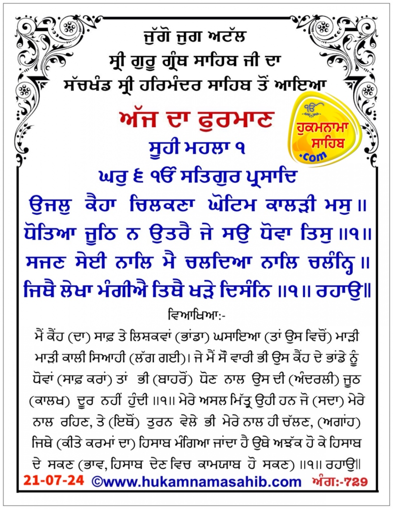 Sachkhand Sri Harmandir Sahib Amritsar Vikhe Hoea Amrit Wele Da Mukhwak: 21-07-2024, Ang 729