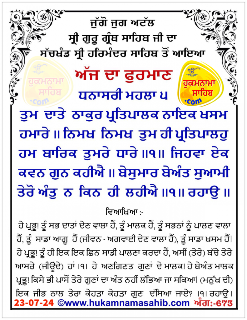 ਅੰਮ੍ਰਿਤ ਵੇਲੇ ਦਾ ਹੁਕਮਨਾਮਾ ਸ੍ਰੀ ਦਰਬਾਰ ਸਾਹਿਬ, ਅੰਮ੍ਰਿਤਸਰ, ਅੰਗ 673, ਮਿਤੀ 23-07-2024