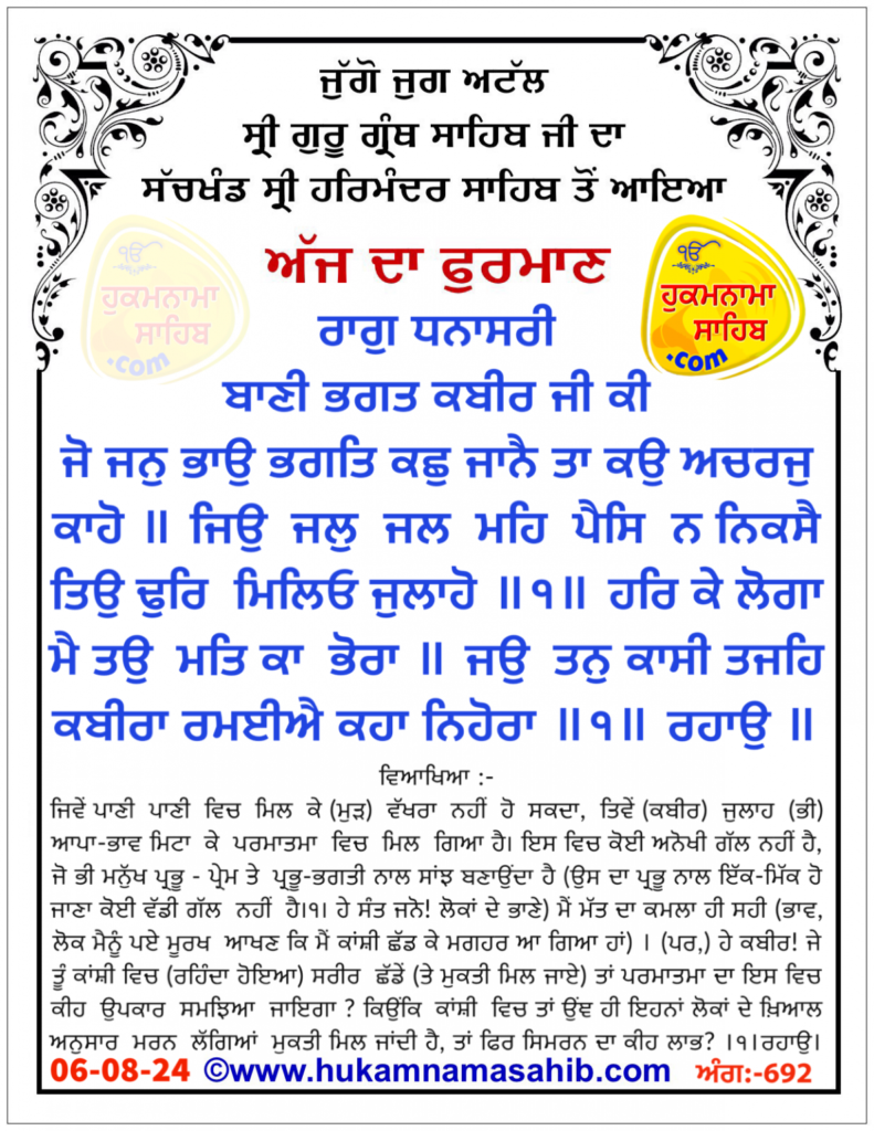 AMRIT VELE DA HUKAMNAMA SRI DARBAR SAHIB AMRITSAR, ANG 692, 06-08-2024