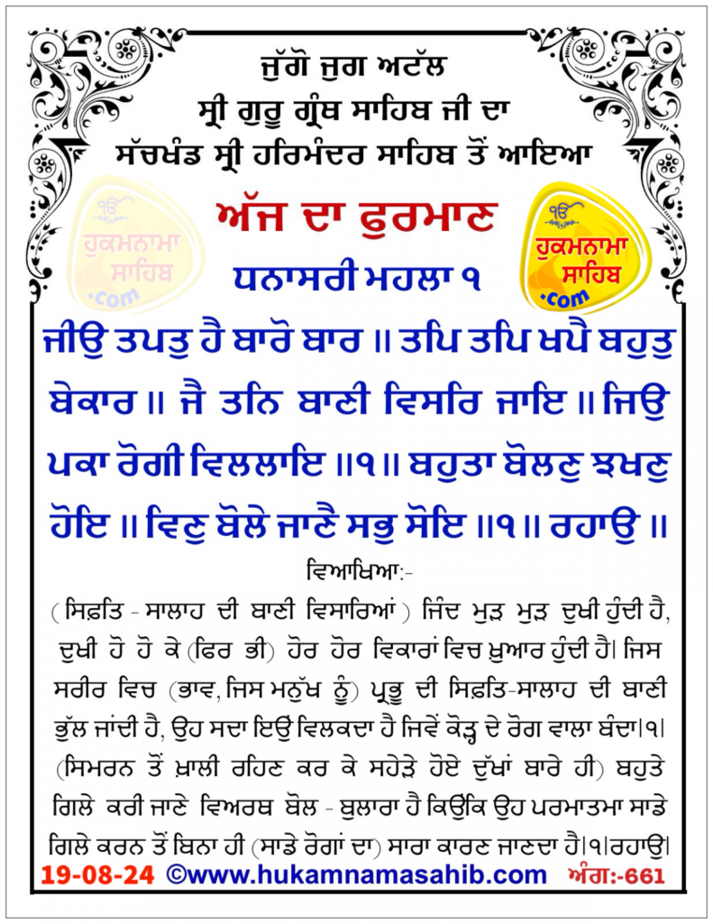 AMRIT VELE DA HUKAMNAMA SRI DARBAR SAHIB, AMRITSARANG 661, 19-08-2024