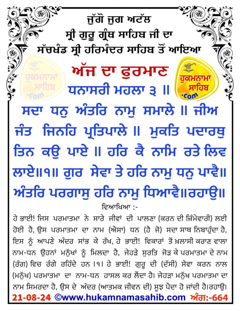 Amrit Vele da Hukamnama Sri Darbar Sahib, AmritsarAng 664, 21-08-2024