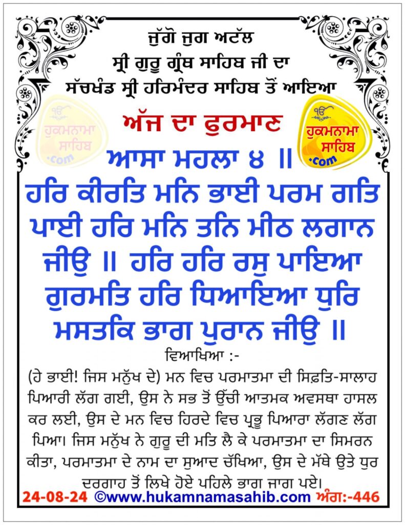 Amritvele da Hukamnama Sri Darbar Sahib, Sri Amritsar, Ang 446, 24-Aug-2024