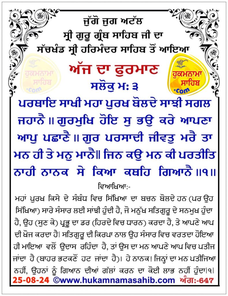 ਅੰਮ੍ਰਿਤ ਵੇਲੇ ਦਾ ਹੁਕਮਨਾਮਾ ਸ੍ਰੀ ਦਰਬਾਰ ਸਾਹਿਬ, ਅੰਮ੍ਰਿਤਸਰ, ਮਿਤੀ 25-08-2024 ਅੰਗ 647