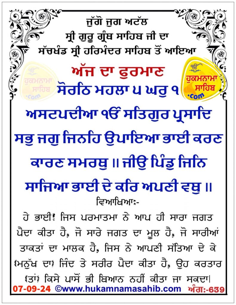 Amrit Vele da Hukamnama Sri Darbar Sahib, Amritsar,Ang 639, 07-09-2024