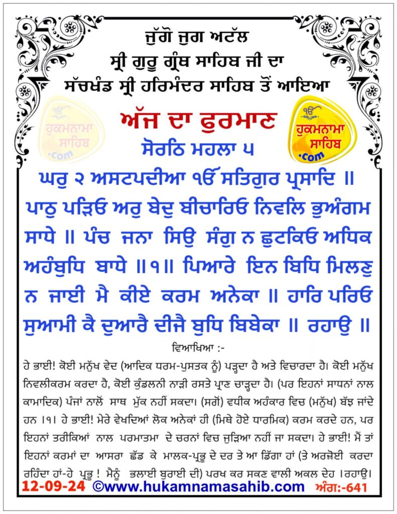 AMRIT VELE DA HUKAMNAMA SRI DARBAR SAHIB AMRITSAR, ANG 641, 12-09-2023