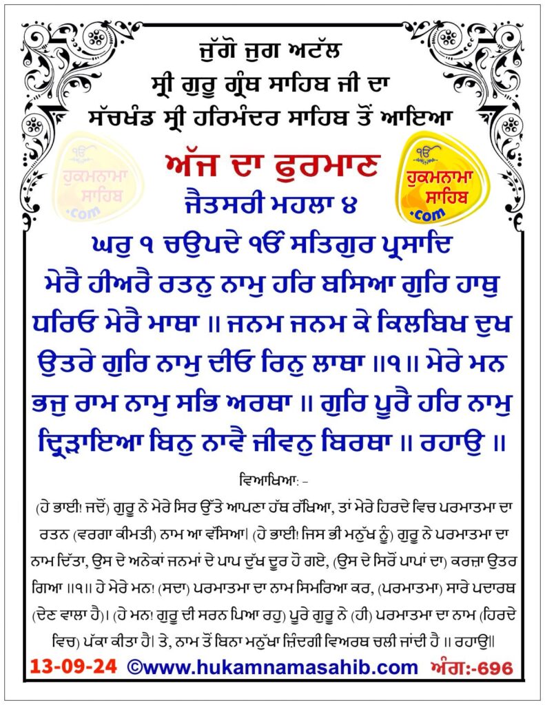 Sachkhand Sri Harmandir Sahib Amritsar Vikhe Hoyea Amrit Wele Da MukhwakAng 696 : 13-09-2024