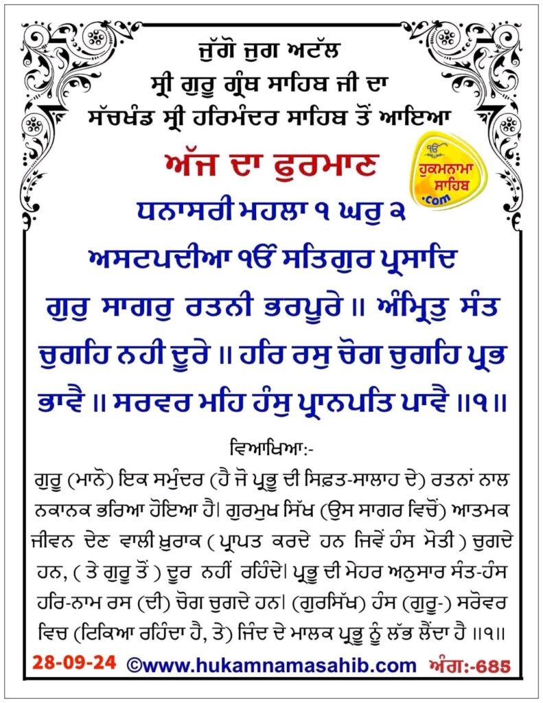 ਵਿਆਖਿਆ: ਧਨਾਸਰੀ ਮਹਲਾ ੧ ਘਰੁ ੨ ਅਸਟਪਦੀਆ ੴ ਸਤਿਗੁਰ ਪ੍ਰਸਾਦਿ ॥ਗੁਰੂ ਮਾਨੋ ਇਕ ਸਮੁੰਦਰ ਹੈ ਜੋ ਪ੍ਰਭੂ ਦੀ ਸਿਫ਼ਤਿ ਸਾਲਾਹ ਦੇ ਰਤਨਾਂ ਨਾਲ ਨਕਾ-ਨਕ ਭਰਿਆ ਹੋਇਆ ਹੈ। ਗੁਰਮੁਖ ਸਿੱਖ ਉਸ ਸਾਗਰ ਵਿਚੋਂ ਆਤਮਕ ਜੀਵਨ ਦੇਣ ਵਾਲੀ ਖ਼ੁਰਾਕ ਪ੍ਰਾਪਤ ਕਰਦੇ ਹਨ, ਜਿਵੇਂ ਹੰਸ ਮੋਤੀ ਚੁਗਦੇ ਹਨ ਤੇ ਗੁਰੂ ਤੋਂ ਦੂਰ ਨਹੀਂ ਰਹਿੰਦੇ। ਪ੍ਰਭੂ ਦੀ ਮੇਹਰ ਅਨੁਸਾਰ ਸੰਤ-ਹੰਸ ਹਰਿ-ਨਾਮ ਰਸ ਦੀ ਚੋਗ ਚੁਗਦੇ ਹਨ। (ਗੁਰਸਿੱਖ) ਹੰਸ ਗੁਰੂ-ਸਰੋਵਰ ਵਿਚ ਟਿਕਿਆ ਰਹਿੰਦਾ ਹੈ, ਤੇ ਜਿੰਦ ਦੇ ਮਾਲਕ ਪ੍ਰਭੂ ਨੂੰ ਲੱਭ ਲੈਂਦਾ ਹੈ ।੧। ਵਿਚਾਰਾ ਬਗਲਾ ਛਪੜੀ ਵਿਚ ਕਾਹਦੇ ਲਈ ਨ੍ਹਾਉਂਦਾ ਹੈ? ਕੁੱਝ ਨਹੀਂ ਖੱਟਦਾ, ਸਗੋਂ ਛਪੜੀ ਵਿਚ ਨਾ ਕੇ ਚਿੱਕੜ ਵਿਚ ਡੁੱਬਦਾ ਹੈ, ਉਸ ਦੀ ਇਹ ਮੈਲ਼ ਦੂਰ ਨਹੀਂ ਹੁੰਦੀ। (ਜੇਹੜਾ ਮਨੁੱਖ ਗੁਰੂ-ਸਮੁੰਦਰ ਨੂੰ ਛੱਡ ਕੇ ਦੇਵੀ ਦੇਵਤਿਆਂ ਆਦਿਕ ਹੋਰ ਹੋਰ ਦੇ ਆਸਰੇ ਭਾਲਦਾ ਹੈ ਉਹ, ਮਾਨੋ, ਛਪੜੀ ਵਿਚ ਹੀ ਨਾ ਰਿਹਾ ਹੈ। ਉਥੋਂ ਉਹ ਹੋਰ ਮਾਇਆ-ਮੋਹ ਦੀ ਮੈਲ ਸਹੇੜ ਲੈਂਦਾ ਹੈ) । ੧। ਰਹਾਉ। ਗੁਰਸਿੱਖ ਬੜਾ ਸੁਚੇਤ ਹੋ ਕੇ ਪੂਰੀ ਵੀਚਾਰ ਨਾਲ ਜੀਵਨ-ਸਫ਼ਰ ਵਿਚ ਪੈਰ ਰੱਖਦਾ ਹੈ। ਪਰਮਾਤਮਾ ਤੋਂ ਬਿਨਾ ਕਿਸੇ ਹੋਰ ਆਸਰੇ ਦੀ ਭਾਲ ਛੱਡ ਕੇ ਪਰਮਾਤਮਾ ਦਾ ਹੀ ਬਣ ਜਾਂਦਾ ਹੈ। ਪਰਮਾਤਮਾ ਦੇ ਨਾਮ ਦਾ ਰਸ ਚੱਖ ਕੇ ਗੁਰਸਿੱਖ ਉਹਪਦਾਰਥ ਹਾਸਲ ਕਰ ਲੈਂਦਾ ਹੈ ਜੋ ਮਾਇਆ ਦੇ ਮੋਹ ਤੋਂ ਖ਼ਲਾਸੀ ਦਿਵਾ ਦੇਂਦਾ ਹੈ। ਜਿਸ ਦੀ ਗੁਰੂ ਨੇ ਸਹਾਇਤਾ ਕਰਦਿੱਤੀ ਉਸ ਦੇ ਜਨਮ ਮਰਨ ਦੇ ਗੇੜ ਮੁੱਕ ਗਏ ।੨। ਜਿਵੇਂ ਹੰਸ ਮਾਨਸਰੋਵਰ ਨੂੰ ਛੱਡ ਕੇ ਨਹੀਂ ਜਾਂਦਾ, ਤਿਵੇਂ ਜੇਹੜਾ।ਸਿੱਖ ਗੁਰੂ ਦਾ ਦਰ ਛੱਡ ਕੇ ਨਹੀਂ ਜਾਂਦਾ ਉਹ ਪ੍ਰੇਮ ਭਗਤੀ ਦੀ ਬਰਕਤਿ ਨਾਲ ਅਡੋਲ ਆਤਮਕ ਅਵਸਥਾ ਵਿਚ ਲੀਨ ਹੋਜਾਂਦਾ ਹੈ। ਜੇਹੜਾ ਗੁਰਸਿੱਖ-ਹੰਸ, ਗੁਰੂ-ਸਰੋਵਰ ਵਿਚ ਟਿਕਦਾ ਹੈ, ਉਸ ਦੇ ਅੰਦਰ ਗੁਰੂ-ਸਰੋਵਰ ਆਪਣਾ ਆਪਪਰਗਟ ਕਰਦਾ ਹੈ, ਉਸ ਸਿੱਖ ਦੇ ਅੰਦਰ ਗੁਰੂ ਵੱਸ ਪੈਂਦਾ ਹੈ, ਇਹ ਕਥਾ ਅਕੱਥ ਹੈ ਭਾਵ, ਇਸ ਆਤਮਕ ਅਵਸਥਾ ਦਾਬਿਆਨ ਨਹੀਂ ਹੋ ਸਕਦਾ। ਸਿਰਫ਼ ਇਹ ਕਹਿ ਸਕਦੇ ਹਾਂ ਕਿ ਗੁਰੂ ਦੇ ਬਚਨਾਂ ਉਤੇ ਤੁਰ ਕੇ ਉਹ ਲੋਕ ਪਰਲੋਕ ਵਿਚਆਦਰ ਪਾਂਦਾ ਹੈ ।੩। ਜੇਹੜਾ ਕੋਈ ਵਿਰਲਾ ਪ੍ਰਭੂ-ਚਰਨਾਂ ਵਿਚ ਜੁੜਿਆ ਬੰਦਾ ਅਫੁਰ ਅਵਸਥਾ ਵਿਚ ਟਿਕਦਾ ਹੈ, ਉਸਦੇ ਅੰਦਰ ਇਸਤ੍ਰੀ ਮਰਦ ਵਾਲੀ ਤਮੀਜ਼ ਨਹੀਂ ਰਹਿੰਦੀ। ਭਾਵ, ਉਸ ਦੇ ਅੰਦਰ ਕਾਮ ਚੇਸ਼ਟਾ ਜੋਰ ਨਹੀਂ ਪਾਂਦੀ। ਦੱਸੋ,ਕੋਈ ਇਹ ਸੰਕਲਪ ਕਰ ਭੀ ਕਿਵੇਂ ਸਕਦਾ ਹੈ? ਕਿਉਂਕਿ ਉਹ ਤਾਂ ਸਦਾ ਉਸ ਪਰਮਾਤਮਾ ਵਿਚ ਸੁਰਤਿ ਜੋੜੀ ਰੱਖਦਾ ਹੈਜਿਸ ਦੀ ਜੋਤਿ ਤਿੰਨਾਂ ਭਵਨਾਂ ਵਿਚ ਵਿਆਪਕ ਹੈ ਅਤੇ ਦੇਵਤੇ, ਮਨੁੱਖ, ਨਾਥ ਆਦਿਕ ਸਭ ਜਿਸ ਸਦਾ-ਥਿਰ ਦੀ ਸਰਨਲਈ ਰੱਖਦੇ ਹਨ ।੪। ਗੁਰਮੁਖ-ਹੰਸ ਗੁਰੂ-ਸਾਗਰ ਵਿਚ ਟਿਕ ਕੇ ਉਸ ਪ੍ਰਾਨਪਤਿ-ਪ੍ਰਭੂ ਨੂੰ ਮਿਲਦਾ ਹੈ ਜੋ ਆਤਮਕਆਨੰਦ ਦਾ ਸੋਮਾ ਹੈ ਜੋ ਨਿਆਸਰਿਆਂ ਦਾ ਆਸਰਾ ਹੈ। ਗੁਰਮੁਖ ਉਸ ਦੀ ਭਗਤੀ ਦੀ ਰਾਹੀਂ ਅਤੇ ਉਸ ਦੇ ਗੁਣਾਂ ਦੀ ਵਿਚਾਰ ਦੀ ਰਾਹੀਂ ਅਡੋਲ ਆਤਮਕ ਅਵਸਥਾ ਵਿਚ ਟਿਕੇ ਰਹਿੰਦੇ ਹਨ। ਉਹ ਪ੍ਰਭੂ ਆਪਣੇ ਸੇਵਕਾਂ ਦੀ ਭਗਤੀ ਨਾਲ ਪ੍ਰੇਮ ਕਰਦਾ ਹੈ, ਉਹਨਾਂ ਦੇ ਸਾਰੇ ਡਰ ਦੂਰ ਕਰਨ ਦੇ ਸਮਰੱਥ ਹੈ। ਗੁਰਮੁਖਿ ਹਉਮੈ ਮਾਰ ਕੇ ਅਤੇ ਸਾਧ ਸੰਗਤਿ ਵਿਚ ਟਿਕ ਕੇ ਉਸ ਆਨੰਦ-ਮੂਲ ਪ੍ਰਭੂ ਦੇ ਚਰਨਾਂ ਵਿਚ ਜੁੜਦੇ ਹਨ ।੫। ਜੇਹੜਾ ਮਨੁੱਖ ਵਿਚਾਰੇ ਬਗੁਲੇ ਵਾਂਗ ਹਉਮੈ ਦੀ ਛਪੜੀ ਵਿਚ ਹੀ ਨ੍ਹਾਉਂਦਾ ਰਹਿੰਦਾ ਹੈ ਤੇ ਆਪਣੇ ਆਤਮਕ ਜੀਵਨ ਨੂੰ ਨਹੀਂ ਪਛਾਣਦਾ, ਉਹ ਹਉਮੈ ਵਿਚ ਭਟਕ ਭਟਕ ਕੇ ਦੁਖੀ ਹੁੰਦਾ ਹੈ; ਪਰਮਾਤਮਾ ਤੋਂ ਬਿਨਾ ਕਿਸੇ ਹੋਰ ਆਸਰੇ ਦੀ ਭਾਲ ਕਰਕੇ ਸਹੇੜੀ ਹੋਈ ਆਤਮਕ 