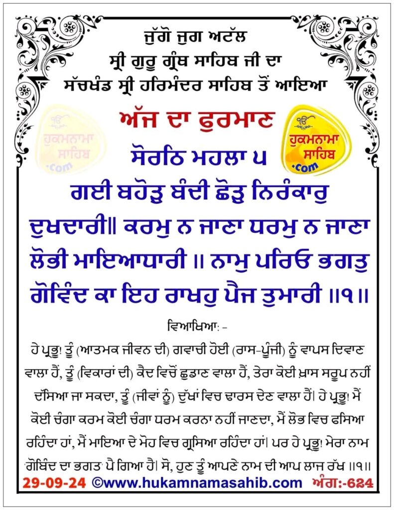 ਅੰਮ੍ਰਿਤ ਵੇਲੇ ਦਾ ਹੁਕਮਨਾਮਾ, ਸ੍ਰੀ ਦਰਬਾਰ ਸਾਹਿਬ ਅੰਮ੍ਰਿਤਸਰ, ਮਿਤੀ 29-09-2024 ਅੰਗ 624