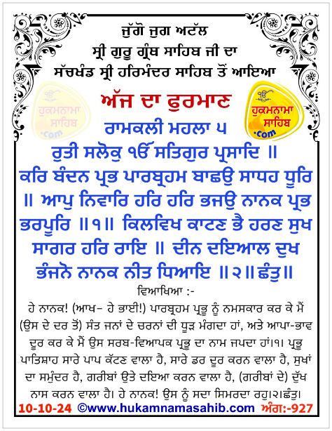Amrit vele da Hukamnama, Sri Darbar Sahib Amritsar Ang 927, 10-Oct-2024