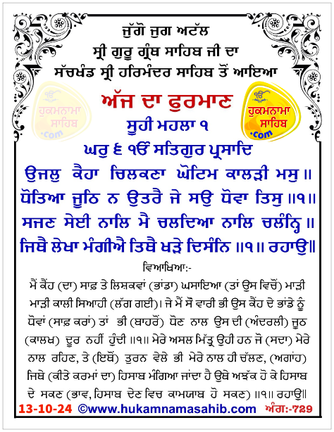 Amrit Wele Da Hukamnama Sachkhand Sri Harmandir Sahib AmritsarAng 729, 13-10-2024
