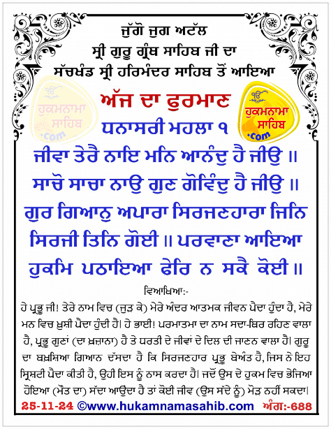 Sachkhand Sri Harmandir Sahib Amritsar Amrit Wele Da Mukhwak, 25-11-2024 Ang 688