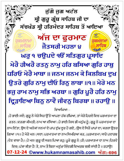 Amrit Wele Da Mukhwak Sachkhand Sri Harmandir Sahib Amritsar, Ang 696 : 07-12-2024