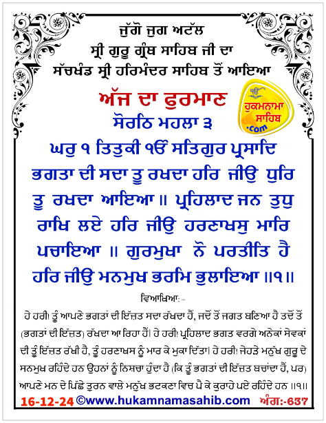 Amrit vele da Hukamnama Sri Darbar Sahib, Sri Amritsar, Ang 637, 16-12-2024
