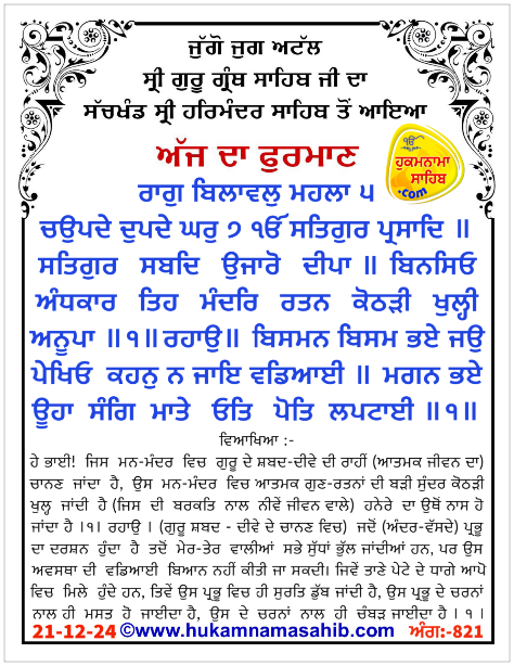 ਅੰਮ੍ਰਿਤ ਵੇਲੇ ਦਾ ਹੁਕਮਨਾਮਾ ਸ੍ਰੀ ਦਰਬਾਰ ਸਾਹਿਬ, ਅੰਮ੍ਰਿਤਸਰ, ਮਿਤੀ 21-12-2024 ਅੰਗ 821