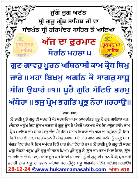 Amrit Wele Da Hukamnama Sachkhand Sri Harmandir Sahib Amritsar, Ang 615, 28-12-2024