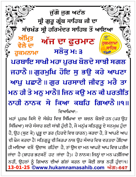 AMRIT VELE DA HUKAMNAMA SRI DARBAR SAHIB, SRI AMRITSAR, ANG 647, 13-01-2025